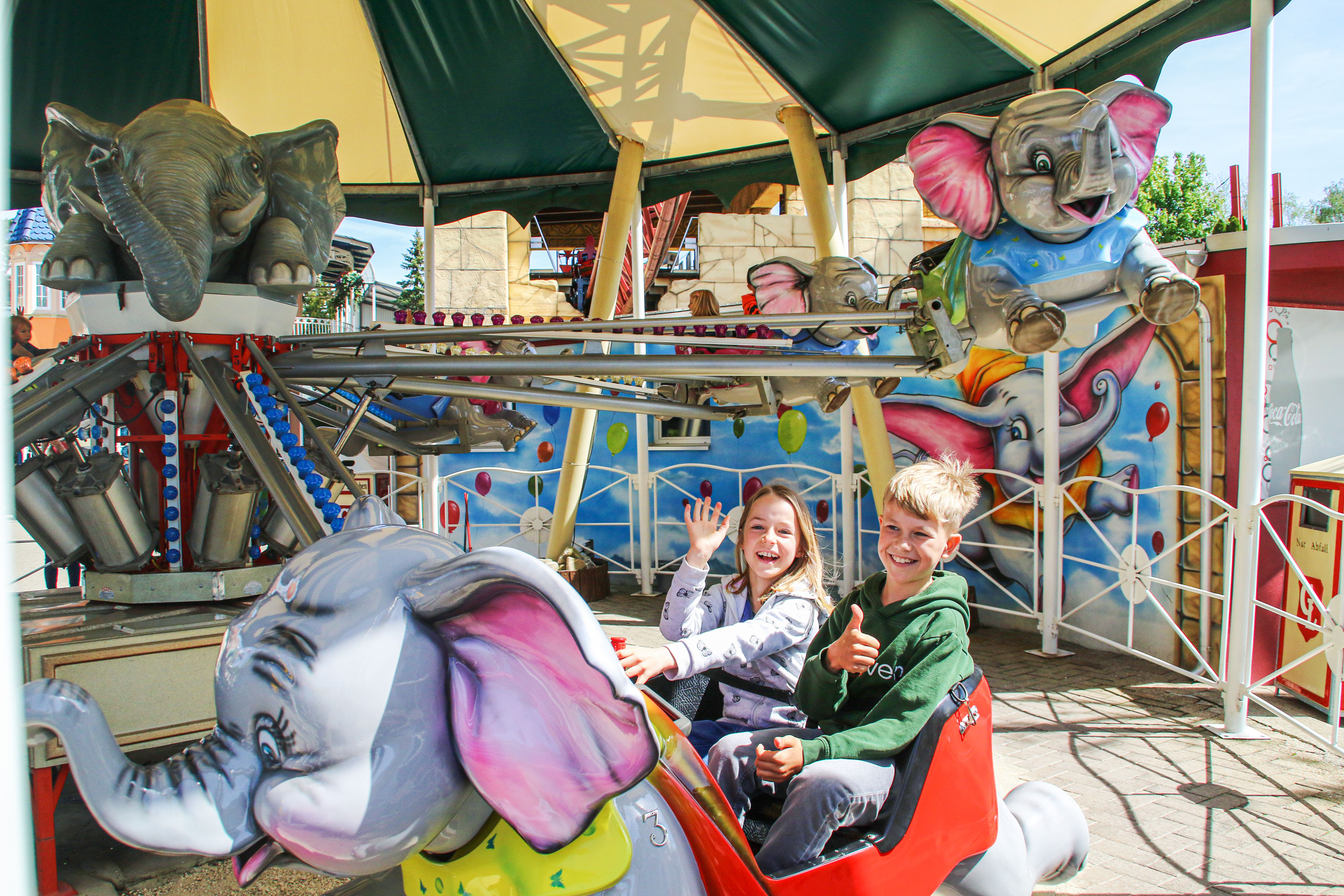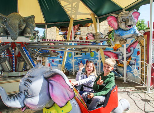 Elefanten, die in die Luft gehen! Ja, auch das bietet der Freizeitpark Conny-Land – allerdings sind die Elefanten Teil eines aussergewöhnlichen Karussels – und damit geht es für die jüngsten Besucher hoch hinaus. Ein luftiger Spass!